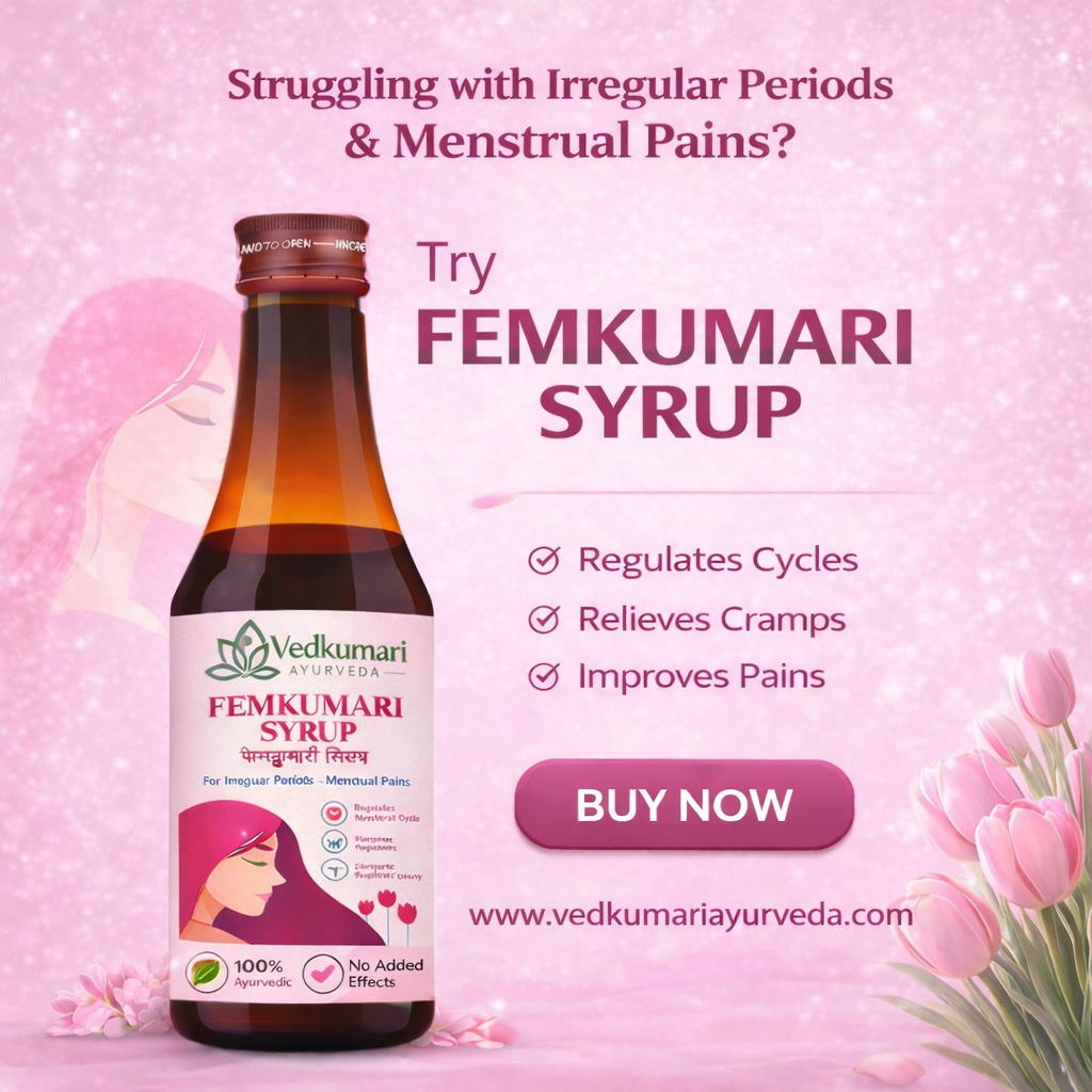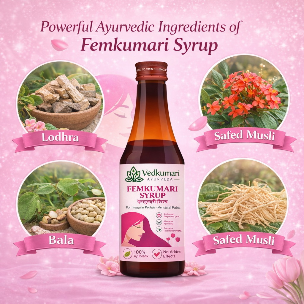 Femkumari Syrup is a carefully formulated Ayurvedic tonic for women designed to support hormonal balance, menstrual health, and overall reproductive wellness.